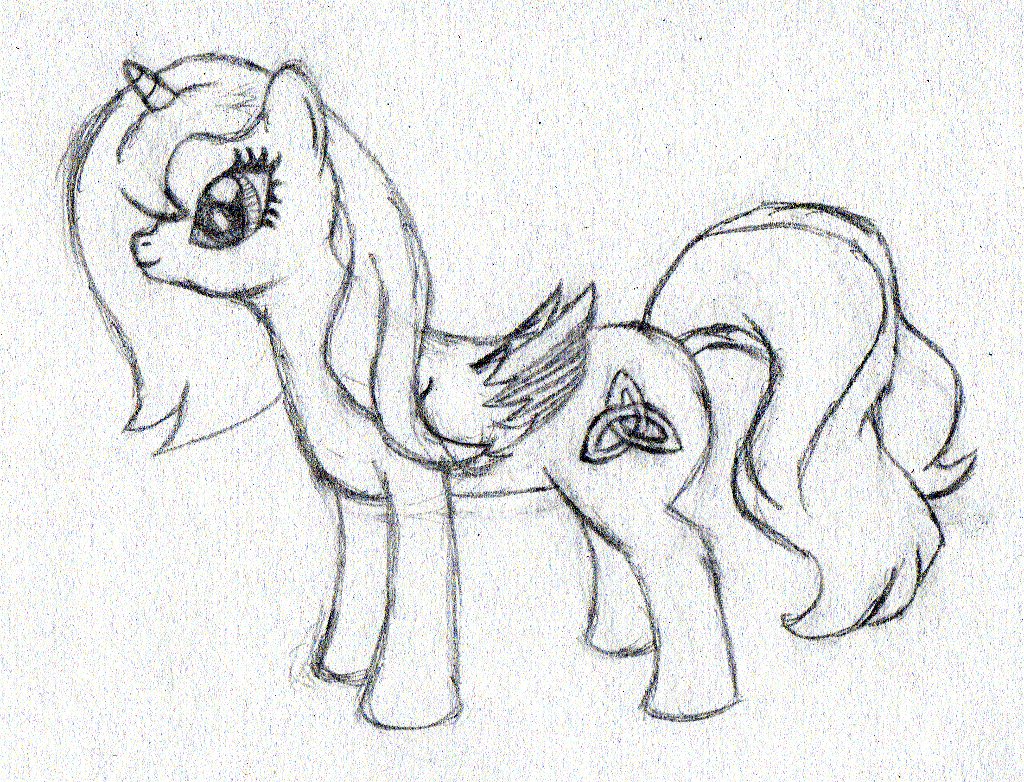 This will eventually be done in colour. This is a ponification request made by my friend, Alana. I was a little worried about getting the hair right since it’s a little complicated and looked really volumous in the reference I was using. It ended up being really easy to draw. Aside from that, I was experimenting with more detailed wings again (although I had done any that were mostly folded in yet), since I feel kind of meh about the stock wings. I think they turned out rather pretty. Oh and the cutie mark is a trifecta, representing body, spirit and mind.