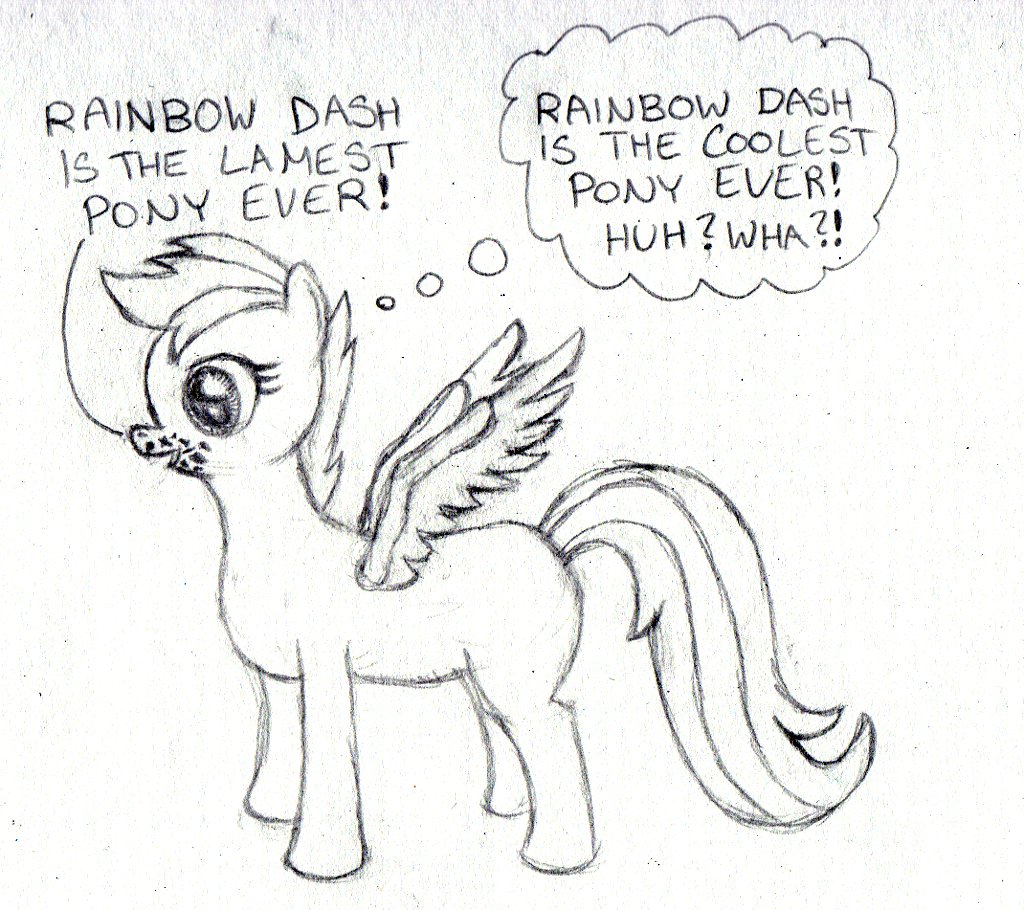 This is my third submission to the DA Artist Training Grounds group’s third weekly theme: draw a pony under the effects of poison joke (pollen causes silly effects rather than being deadly). I was a little shorter on time tonight, so this is a quick less than an hour sketch (and it really should have been sooner, but I was sucking pretty hard at doing the wings for some reason). This is my second time drawing Scootaloo and the first time was long enough ago that I forgot that her tail’s a bit of a pain in that if the proportions aren’t just so, it starts to look really weird. Anyway, a second Cutie Mark Crusader victim has been claimed and now every time Scootaloo tries to fangasm over Dashie, she ends up dissing her idol! The horror! The horror!
