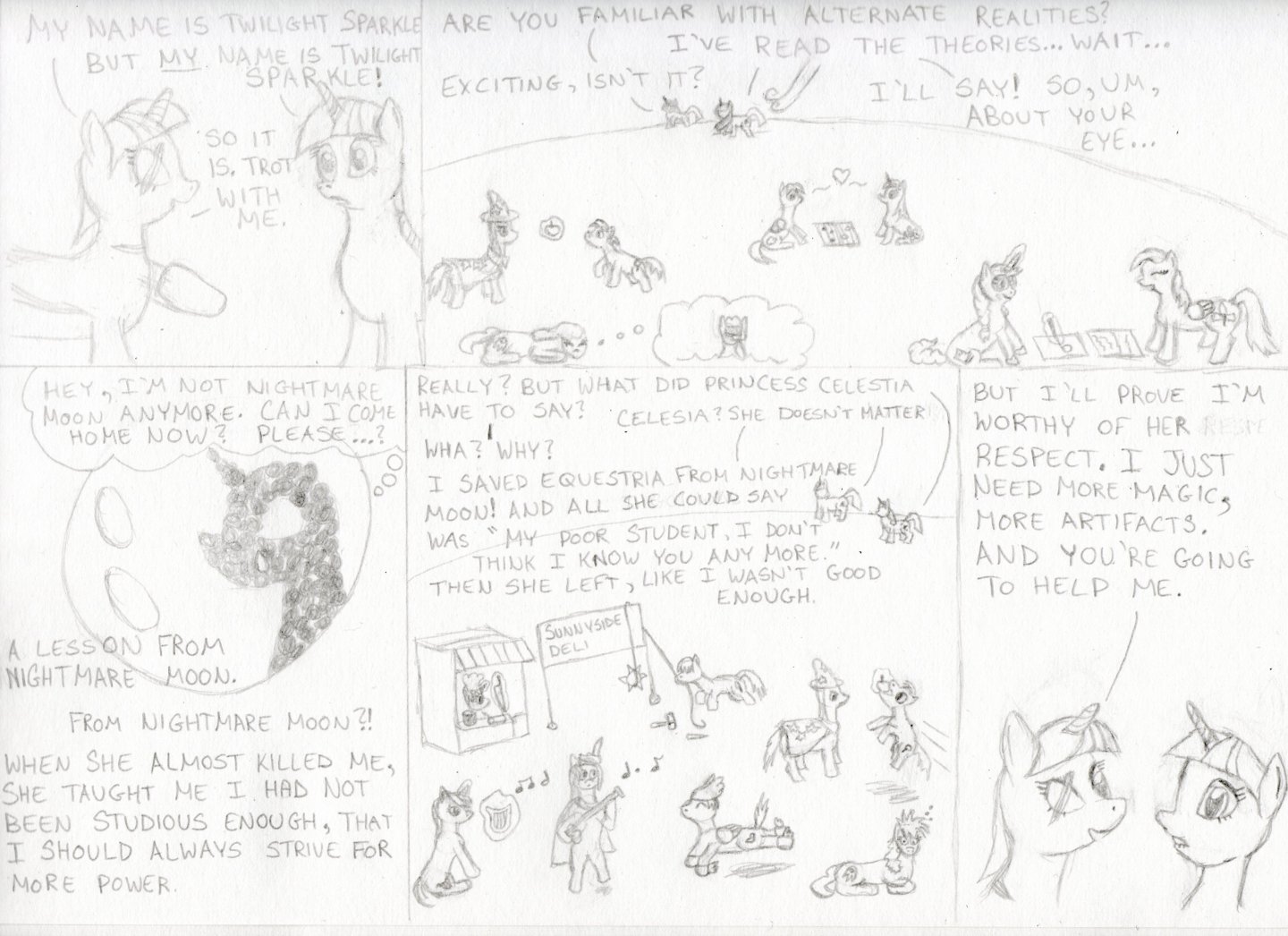 Any previous theme was valid for this one. So a handful of us decided this means we should do all the themes. It took a ton of preplanning, but I managed to fit every single theme into a single 5 panel page AND continue the narration. A full list of the first panel in which a pony fulfills the condition of a theme can be found after this little blurb. This was a really long, exhausting endeavour and, as usual, ponies in the distance are really hard to detail and not have them look like blobs. I was feeling a little off that day too, so I had to erase and redo a bit more than I anticipated, as well.