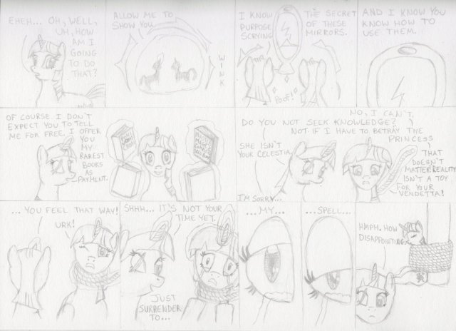 Twilight Sparkle is my favourite pony. When I decided comic pages looked like they’d be fun to do, she was naturally my first choice to center it around. Of course I didn’t realize at the time that creating a work in which Twilight comes into conflict with a super powered evil version of herself would end in me picking on Twilight. A lot.