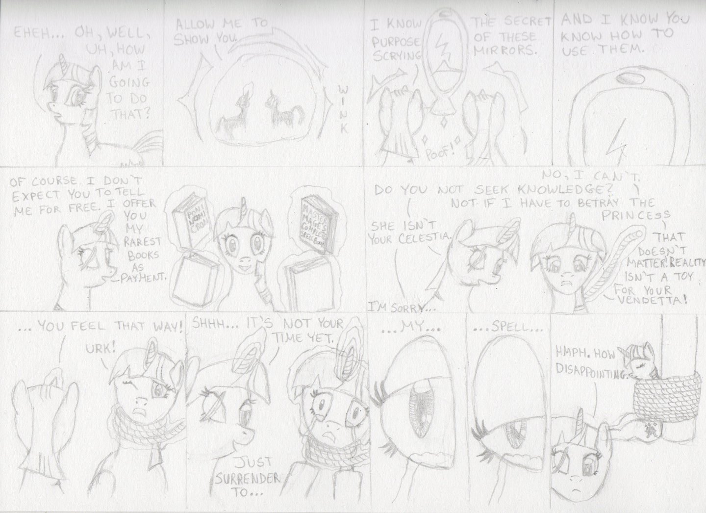 Twilight Sparkle is my favourite pony. When I decided comic pages looked like they’d be fun to do, she was naturally my first choice to center it around. Of course I didn’t realize at the time that creating a work in which Twilight comes into conflict with a super powered evil version of herself would end in me picking on Twilight. A lot.
