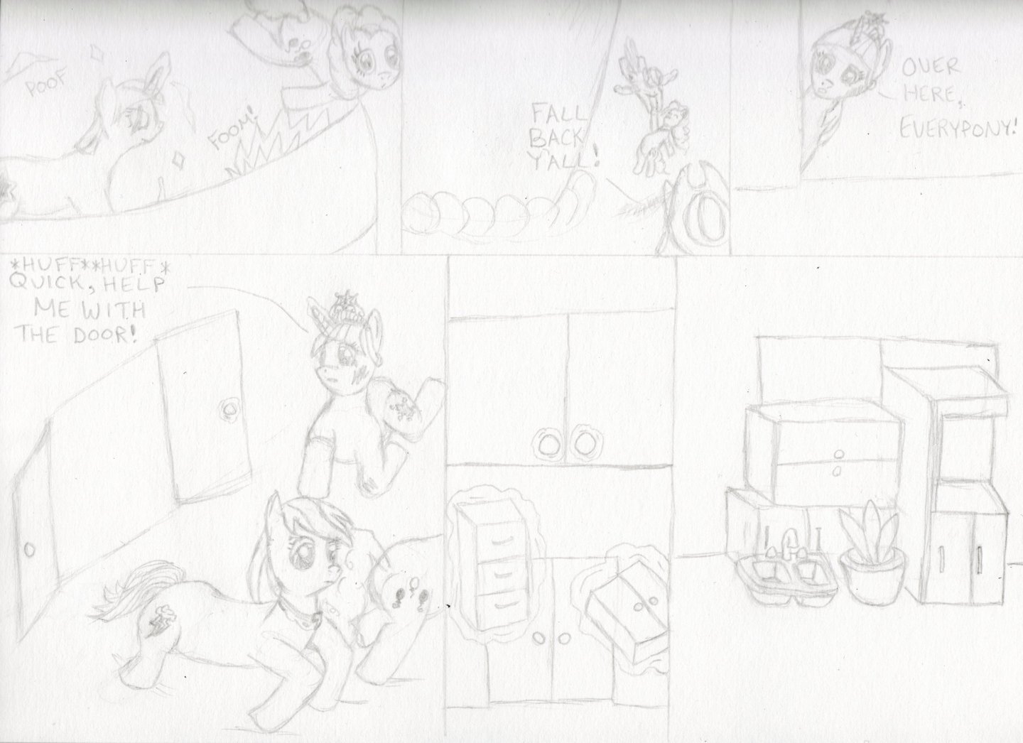 More fun with general practice here, doing different perspectives as the action demands. I forgot to draw the ground underneath Twilight in the 4th panel, which, in addition to the odd pose, makes it unfortunately look pretty off. Basically, the idea is that she can barely stand at this point.
