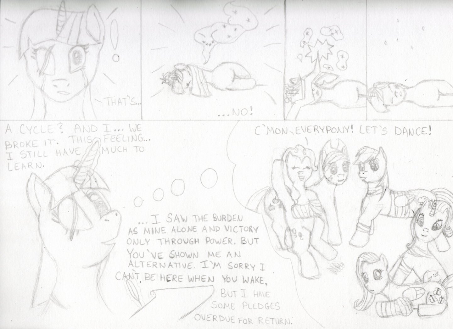I’ll admit it, I’m a sap. I have an aversion to writing in irrevocable injury or downer moments for the main six, even alternate dimension versions of them (see theme 25 for what happens when I try). I had a bit of a rough time with drawing prone Twilight, especially with all the hair being all over the place. I’m a little unhappy with how my altered perspective interpretation of a dancing Pinkie Pie frame I was referencing didn’t turn out quite as good or dancy as I’d hoped, but the ending group shot is also among my favourites (it also took a long time because of all the overlapping ponies).