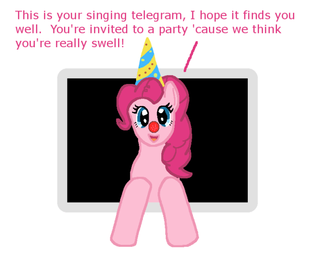 I felt like doing something a little wacky tonight, so I went with 4th wall breaking Pinkie Pie. Originally, I was going to do a “FOR-EVER!” gag, but then the singing telegram idea came to me and I decided I would rather do that one. So I guess Pinkie’s inviting everyone to a party.