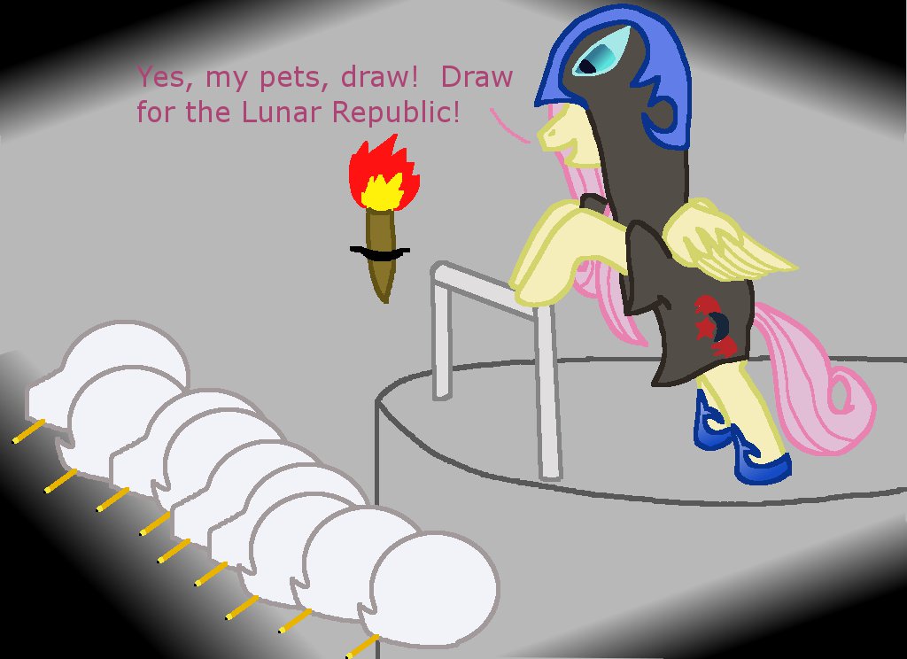 I’ll freely admit here that I was trying to do something a little more artsy and had no idea what I was doing. I ended up with… something (at least something is Pinkie’s favourite, right?). I wanted to do more with that creeping darkness, but I was hard time getting anything better looking and my Googlefu was failing me. Doing all the props digitally was kind of interesting. I was going to redo the lines for Lunar’s platform, but the cragginess (is that even a word?) actually fit pretty well.