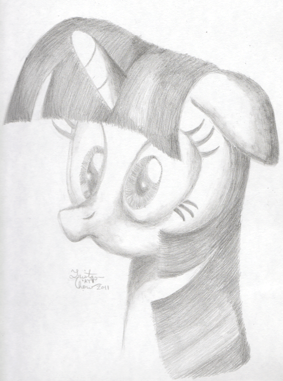 Anyway, this is more shading practice. I was originally going to go with the expression from when her mind snaps in Swarm of the Century, but the positioning was really similar to the last two I’ve done, so I went with a different kind of mind broken pose. This is Twilight’s reaction face to the Cutie Mark Crusaders in Showstoppers when they’re spouting some particularly inane stuff. Anyway, the main thing is that the ear, hair and snout are all in vastly different positions from before.