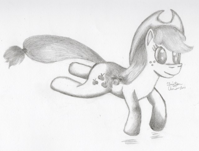 Anyway, I really need to stop doing this to myself. And by that, I mean letting my mind get all contrary on me. I was going to do something simpler (for like the 10th time). So I started out randomly sketching out Applejack. And my mind was like “Hey, she should be jumping. And at a weird angle.” Then after that, it was like “You should also shade this. And have two light sources.”