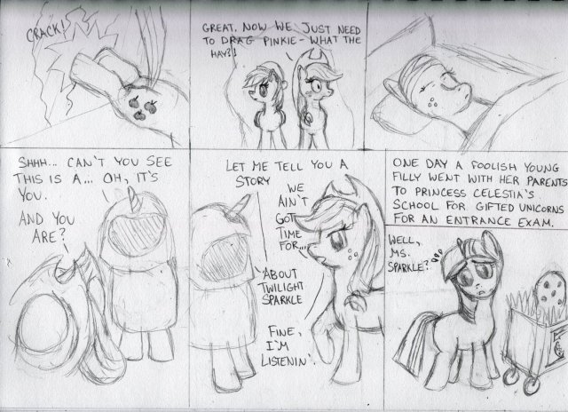 *gasp* More alternate reality shenanigans with Applejack watching… herself sleep! Also, oops another cliffhanger. But I at least got to start the flashback sequence. Filly Twilight turned out surprisingly well for how fast I sketched her. The rest is about on par with what the last couple pages have looked like.