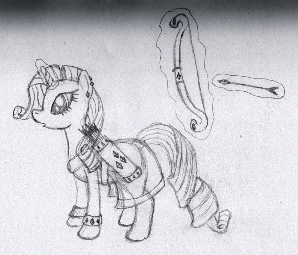 Damn you and your hair, Rarity! Anyway, I crammed as many gems into this outfit as I thought I could get away with. She’s got 3 for earrings (I borrowed these from her Gala dress), 1 on the front of her cloak clasp, 3 each on the foreleg bracelets (although the rear one faces the gems away from the viewer), 9 on her quiver, which includes 3 in the shape of her cutie mark. Plus 3 more on her bow and at least the arrow she is currently nocking is diamond tipped. Which also makes this one of the most impractical outfits I’ve ever designed. Good luck hiding from anypony to do your sniping, Rarity.