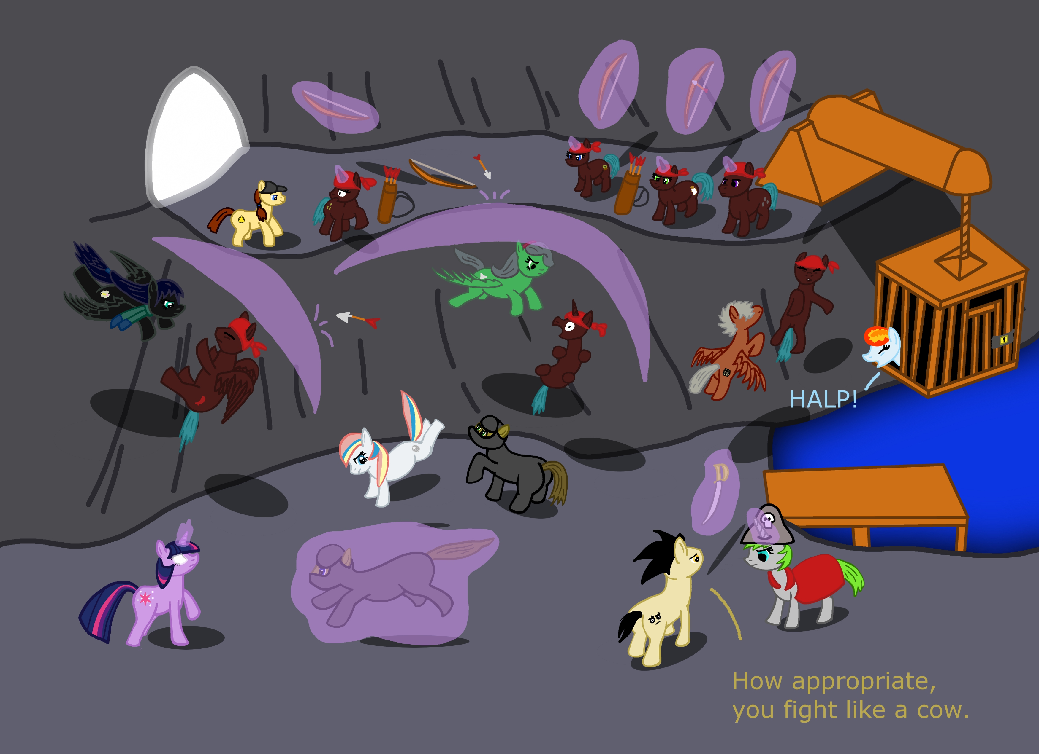 In total there are 18 ponies. One of them a hostage, seven of them part of the rescue force and the rest are the allied forces of ninja and pirates. “Gasp!” you say? Well, let’s just say the two sides’ dirty secret is they were never at odds. Instead they staged battles to leave bystanders in awe and while said bystanders were distracted, spies from either team would make off with all their valuables. It was the perfect get rich scheme. Until the ATG admins tried to use the fake feud as a theme. While we were all distracted, the pirates and ninja tried to make off with the admins’ valuables. But finding the admins not as rich as they wanted, the now enraged pirates and ninja kidnapped the admins and have been playing a friendly game of capture the flag, using the admins as the flags.