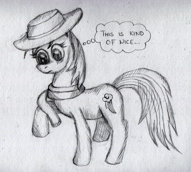 This is my third submission for the Artist Training Grounds’ week 16 theme: draw a pony from another decade. This time, G4 Dashie has somehow ended up dressed in one of G3 Rainbow Dash’s outfits, specifically the one used in that song about Rainbow Dash always dressing in style. However, everyone has done Dashie hating on that clip, so I thought I’d try a different little twist.