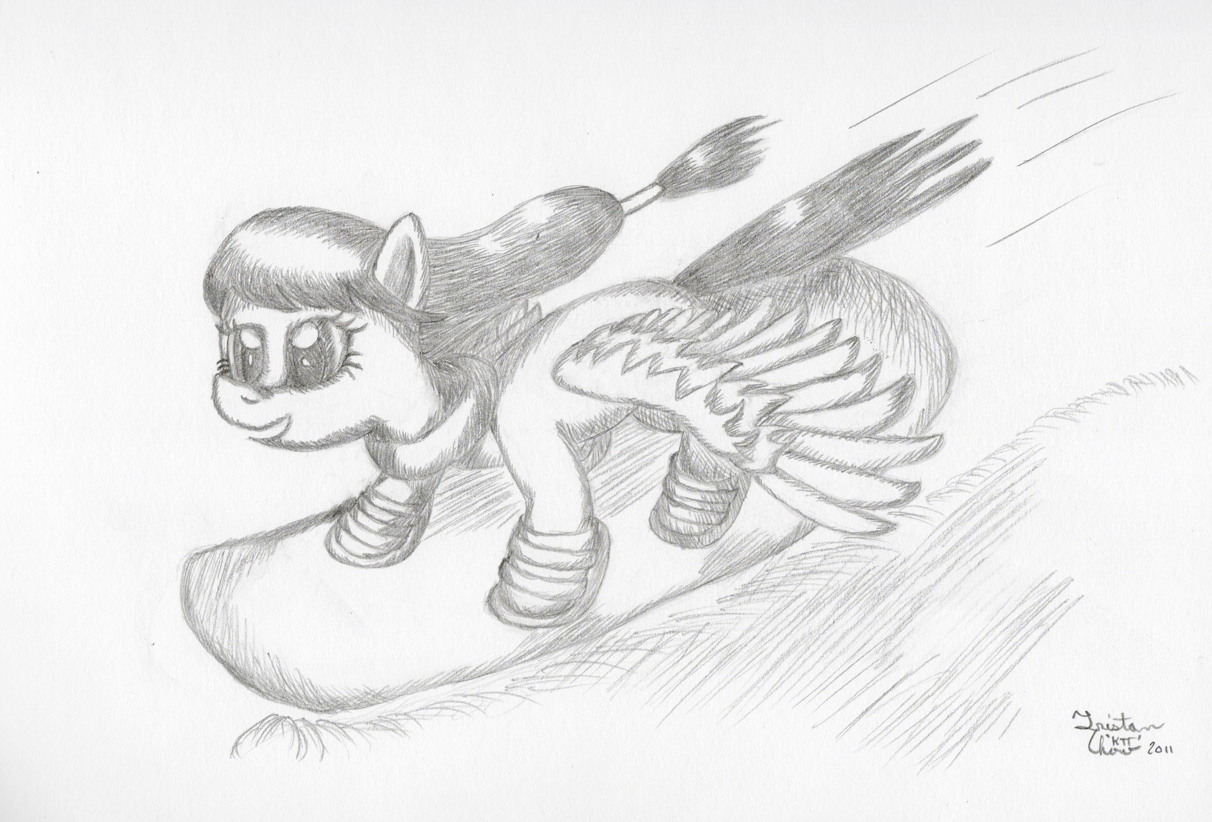 This was a challenging pose and I struggled to get the visible wing to look right, but it was totally worth it. Snowboard is a little rough, but I was kind of improving, trying to come up with a design for a heavy four legged animal. The only real stipulation on me from the request was to have Dusky using her wing power to accelerate, so I had to choose a positioning that would let her flap her wings and not have it knock her over. Other than that, I think I maybe have misplaced her shadow a bit.