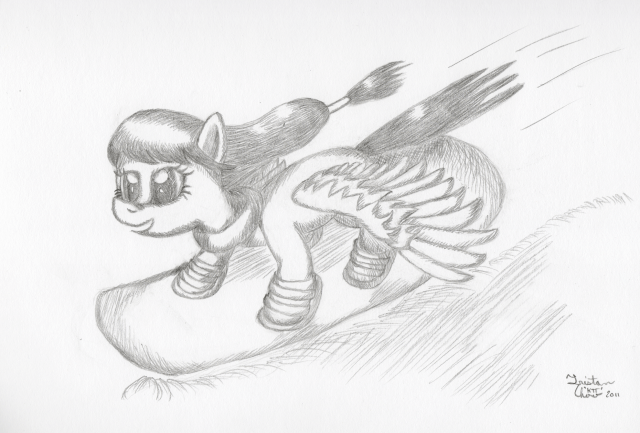 Well, this is something of a request from Fox_E. After he found out I snowboarded, he told me I needed to draw Dusky snowboarding, so I did. I rarely draw OCs on their own these days, not even my own, so this felt a little weird.
