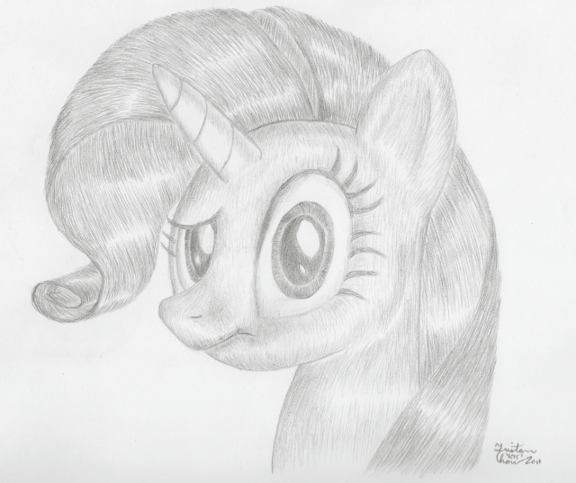 This is the second of two Rarity commissions I’m doing for my friend. Since there were no other constraints, I chose one of Rarity’s best expressions (from Dragonshy). Had to improvise a bit with the mouth, because it just going off of where the show had it positioned would have looked weird, silly or both in my style.