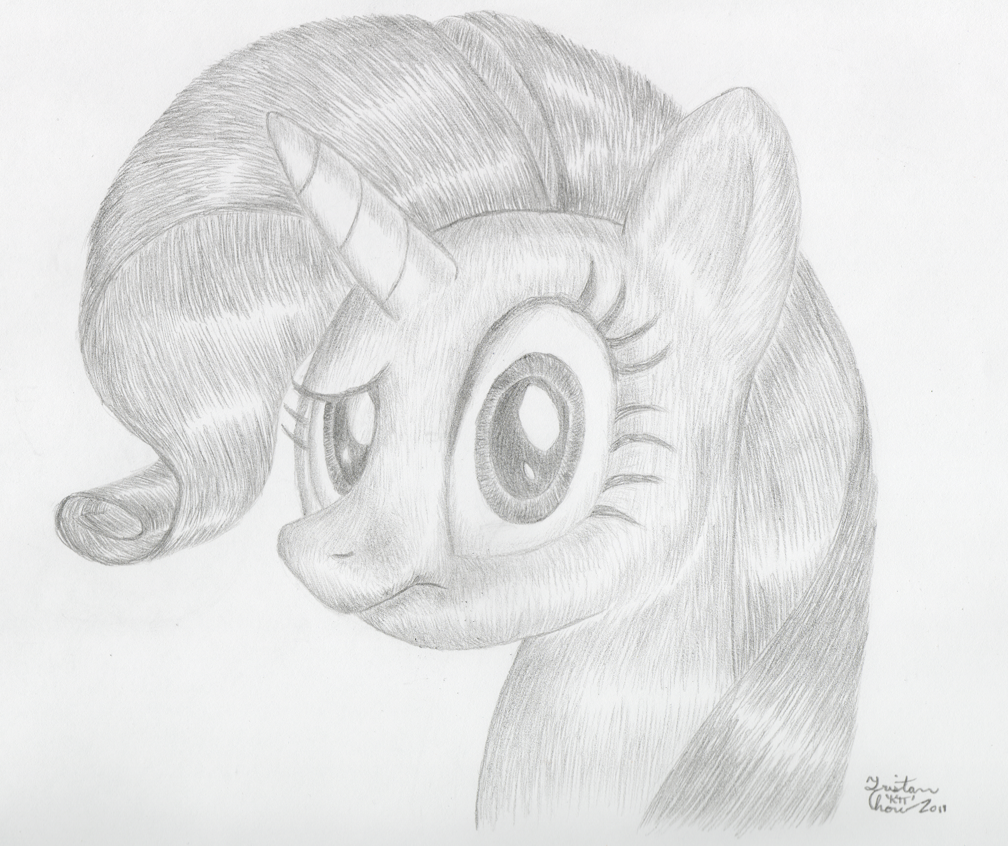 This is the second of two Rarity commissions I’m doing for my friend. Since there were no other constraints, I chose one of Rarity’s best expressions (from Dragonshy). Had to improvise a bit with the mouth, because it just going off of where the show had it positioned would have looked weird, silly or both in my style.