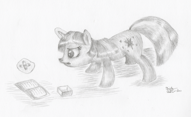 This is my first submission for the Artist Training Grounds’ week 22 theme: draw a pony finding magic flowers. This is more of an aftermath type of drawing, but it’s still related. Twi finds a rare magical flower. What does she do? Why, press and catalog it, of course!