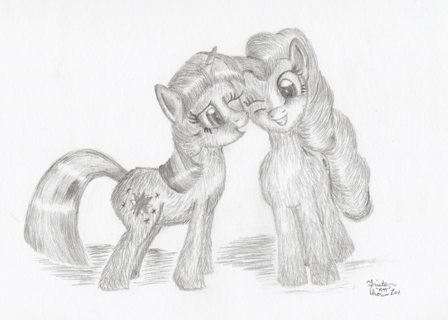 I felt like drawing something cute tonight and settled on nuzzling ponies. I asked the IRC’s owl bot for a pairing and ended up with Twi and Pinkie. So I drew them.