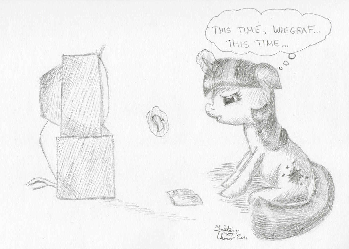 Anyway, this is my first submission for the Artist Training Grounds’ week 25 theme: draw a pony inspired by a book. It’s been a long time since I’ve done wordplay with the theme, but I just had to do this. Twi is inspired by the strategy guide (it’s totally still a book) to kick Wiegraf’s butt after having failed to defeat him the first time. Anyone who has played the game knows exactly which Wiegraf fight I’m talking about.