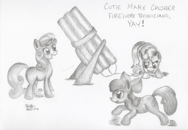 This is my second submission for the Artist Training Grounds’ week 27 theme: draw a pony celebrating New Year’s Eve. Well, here’s three ponies all attempting to celebrate… and get their cutie marks. I’m sure we all know how it’s going to end.