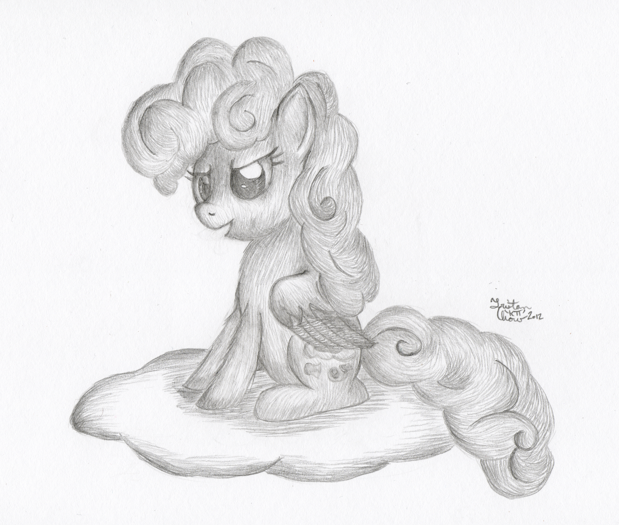 This is my end of an art trade with I-PLUSHIE. She asked me to draw her OC, Butter Whip, on a cloud, so that’s what I did. Monochroming her did some strange and interesting things. Namely that I somehow managed to make her look like Twi, Dashie and Pinkie all at the same time. I tried having her stick her tongue on like in the reference I was working from, but that changed the expression entirely and not really in a good way.