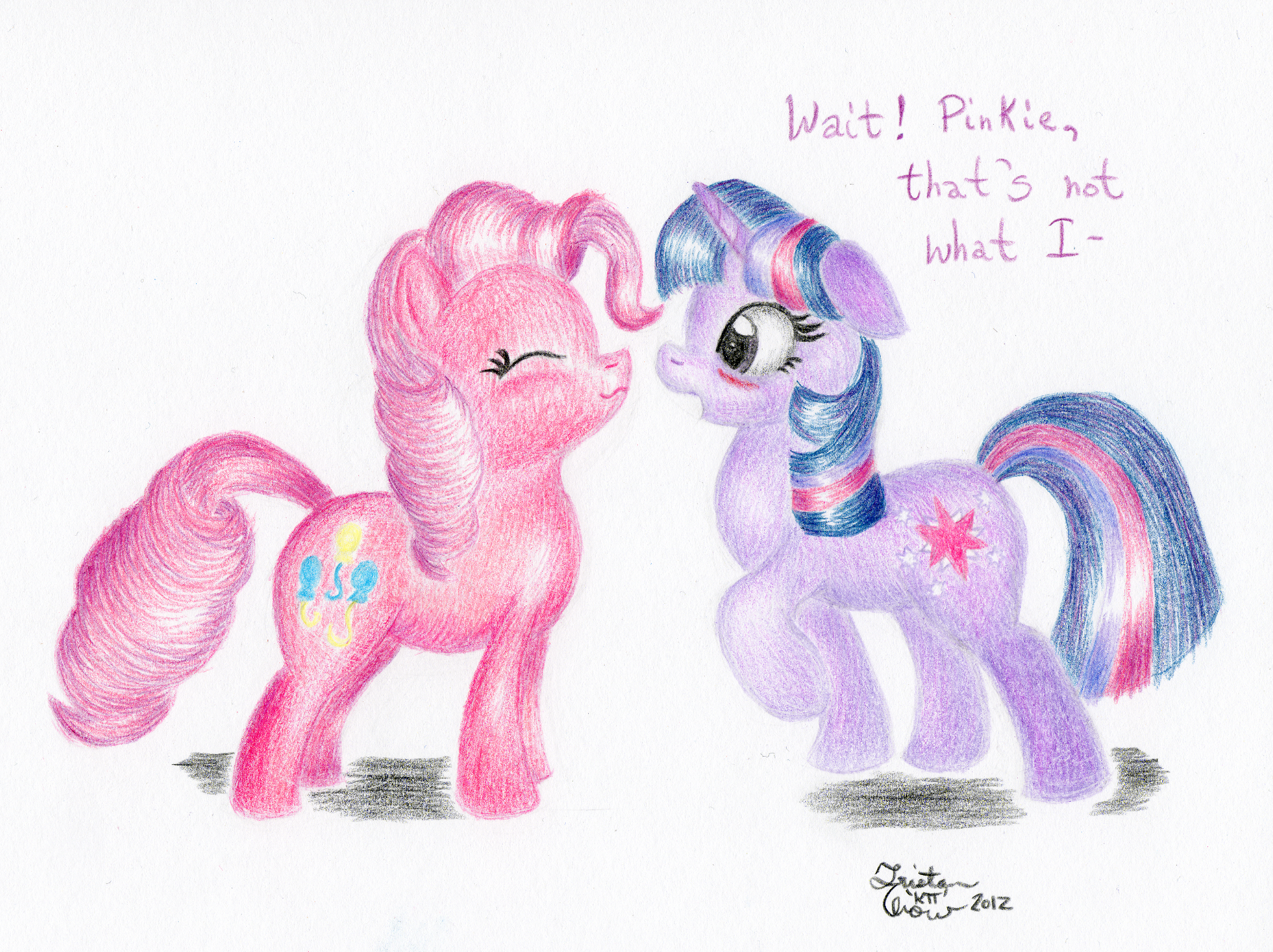 This is my first submission for the Artist Training Grounds’ week 33 theme: draw a pony involved in awkward misunderstanding. Shippy ideas are kind of a rare thing for me and this one was just too cute to pass up. So have Pinkie being on a different page than Twi.
