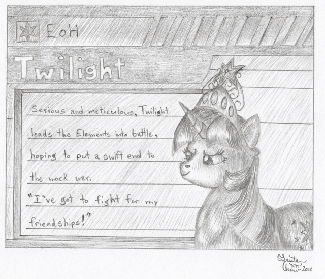 This is my first submission for the Artist Training Grounds’ week 35 theme: draw a pony while imitating an existing work. The top screen of this screenshot is what I was aiming to do my best replica of. Of course, given I’m not much of a digital artist and I was imitating a video game screen, my graphite couldn’t produce anything all that close to exact. This idea basically came to me as a combination of me playing Advance Wars: Days of Ruin again and thinking back to the EqD mock war event.