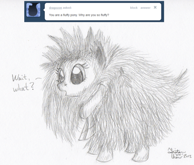 I’m doubling this up as my third submission for the Artist Training Grounds’ week 35 theme: draw a pony in an imitation. I wanted to try seeing how Dusky would look as a super fluffy pony. I think I succeeded in making her look like a mop. XD