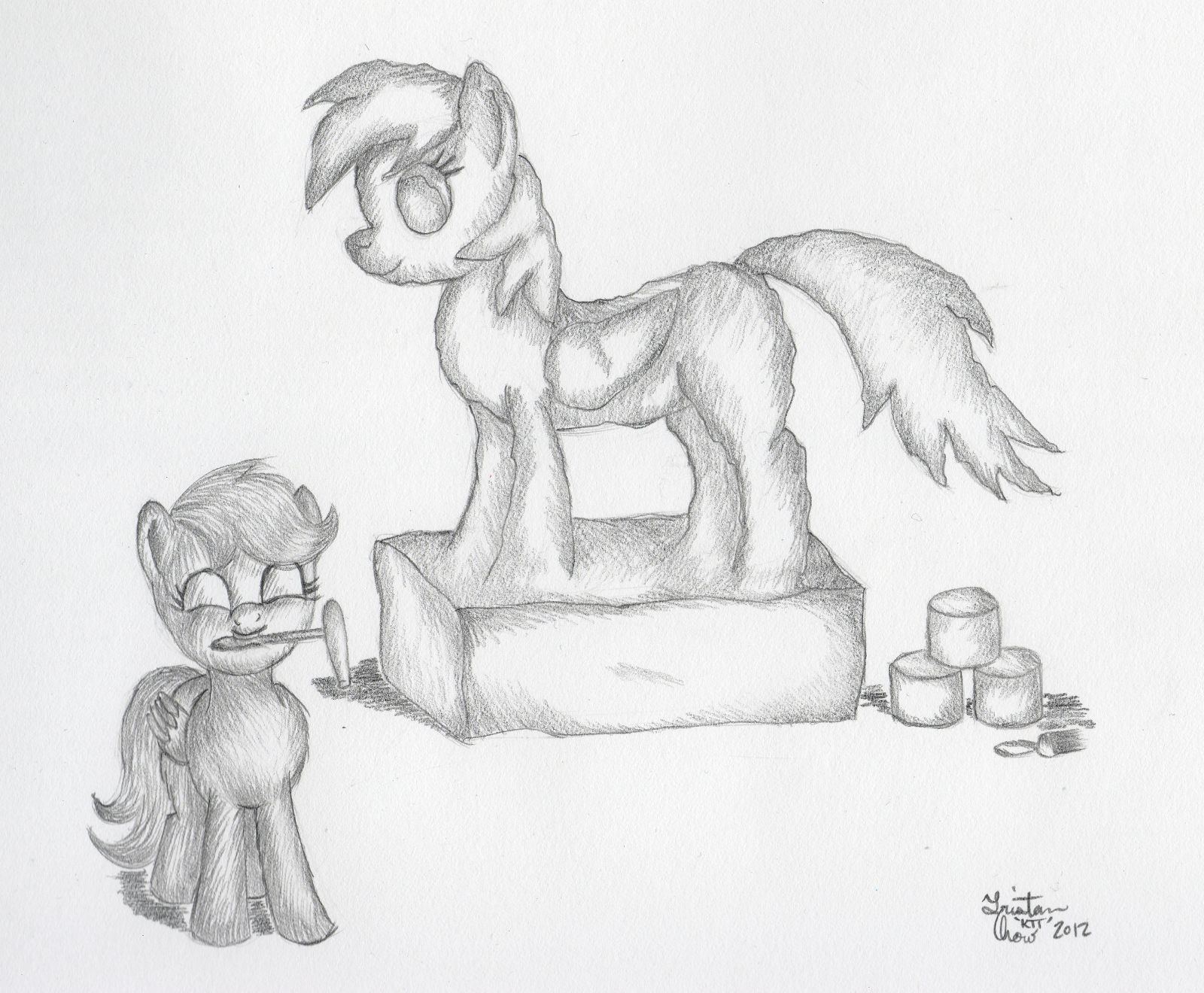 This is my first submission for the Artist Training Grounds’ week 38 theme: draw a pony sculpture. Right after I read the theme, this idea came to mind. Because mocking Scoots’ stalker level Dashie obsession is fun. She probably should have asked Apple Bloom to help, though.