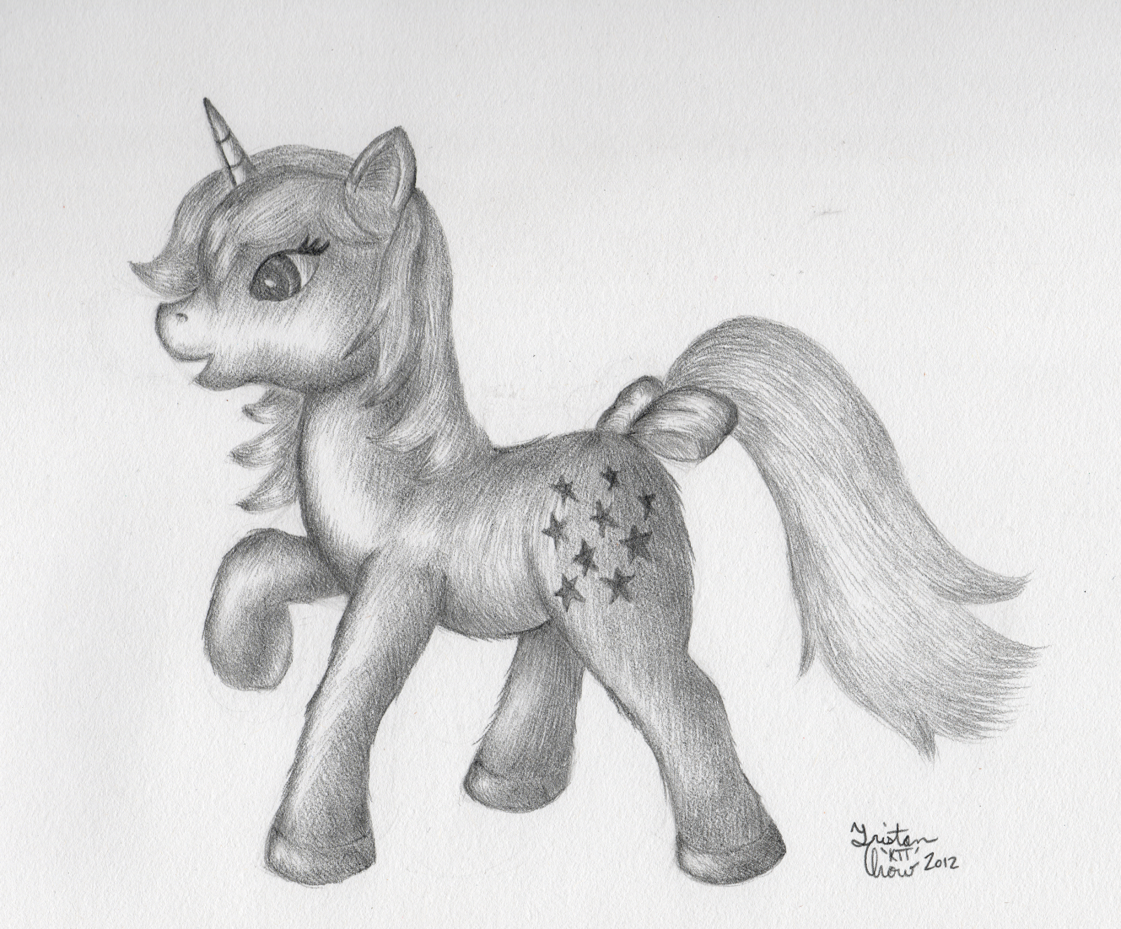 Weee, theme wordplay. This is my second submission for the Artist Training Grounds’ week 40 theme: draw an old pony. So here’s old style Twilight. This is one of those drawings that started out as something quick, but then she looked nice enough that I wanted to do finer detail than cross hatching.