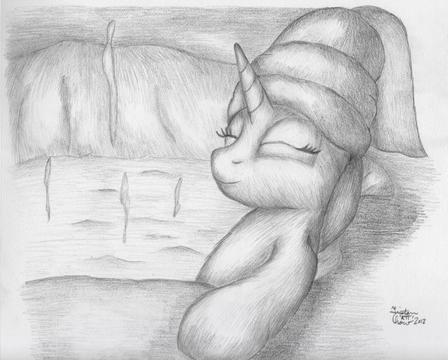 This is my third submission for the Artist Training Grounds’ week 42 theme: draw a pony enjoying spring. So here’s Rarity at a hot spring.