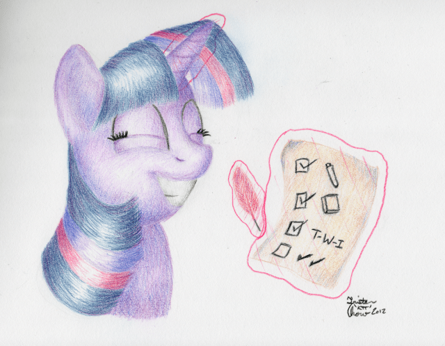 This is my second submission for the Artist Training Grounds’ week 48 theme: draw a triumphant pony. And because I can never have enough Twi, I drew her geeking out over checking off that final box on her latest checklist.