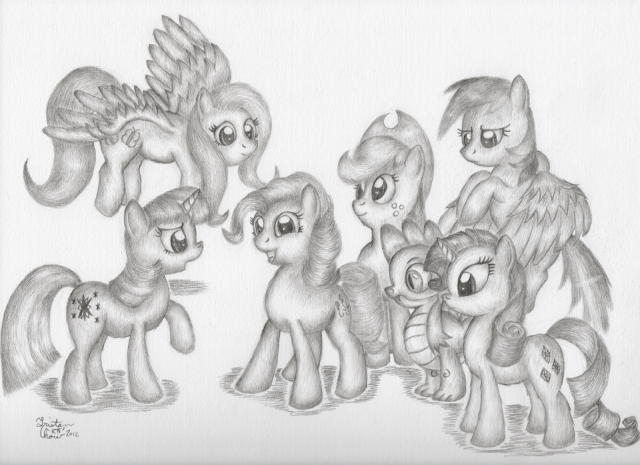 This looks really nice… it really shows how far you’ve come with this art style. Rarity, Spike, and Twilight look pretty much perfect. Pinkie looks good too, even at that angle. Minor gripes: Applejack’s face looks weird, like it’s not at the proper angle it should be, and Rainbow’s hair and tail look monochromatic. I never really noticed before but I love the way you draw wings.