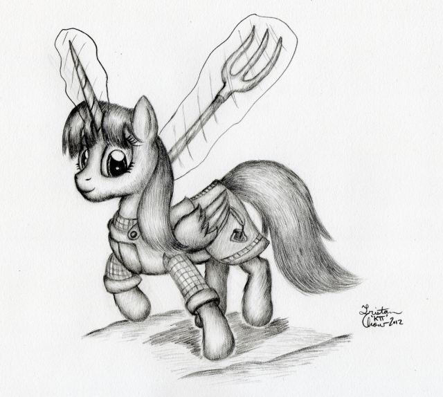 This is my first submission for the Artist Training Grounds’ week 55 theme: draw a pony ready for action. Because Fausticorn is totally ready for farming. Even if that might not be super dramatic.