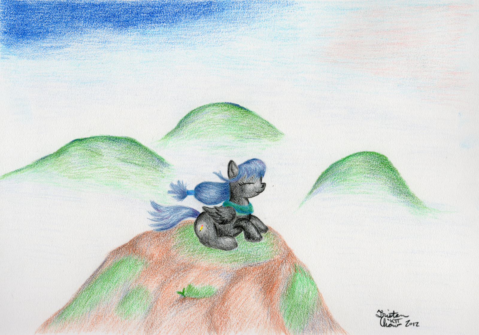 This is my submission for the Aug NATG2012 Day 4 theme: draw a pony on a hill or at her peak. I went with the fairly literal interpretation, although I realized after it could have a double meaning, so weeee. Anyway, I was shooting for soothing and I think I succeeded. I’m a bit iffy with how the mist went, but I think it gets the point across well enough. This one ran me a little over 3.5 hours.