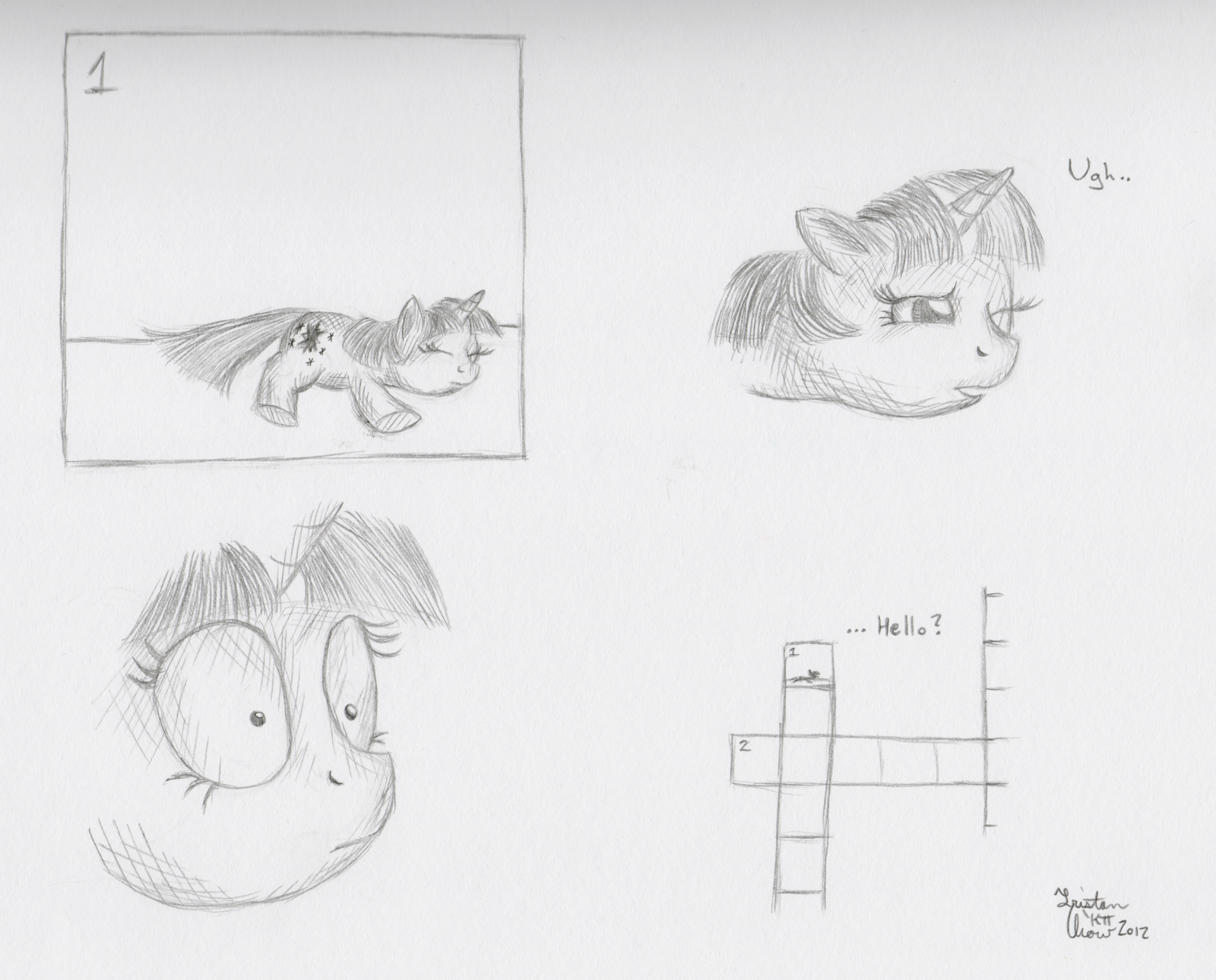 It was around this day count last year that I started working in comic pages. And since I feel like making another random half-coherent story, I’m gonna try to do that again. So here’s my submission for the Aug NATG2012 Day 15 theme – draw a puzzled pony. And Twi is so very puzzled. In more ways than one.