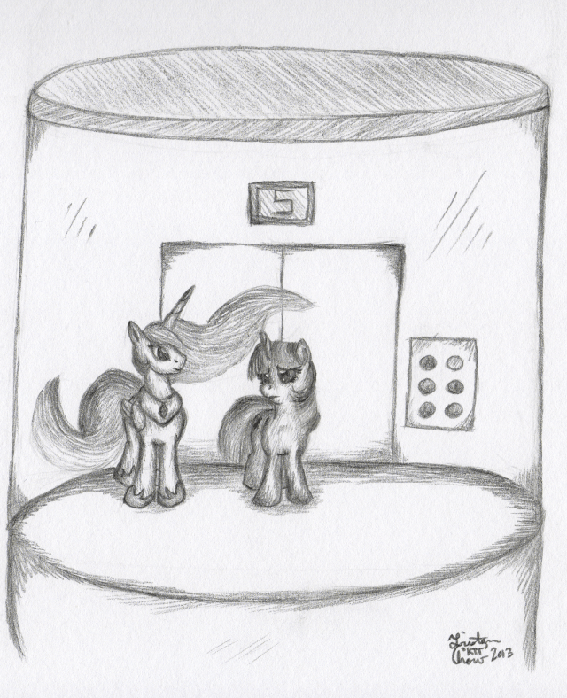 This is my submission for the Artist Training Grounds’ week 87 theme: draw a pony ascending. Drawn mostly from memory (had to cheat a little bit and check the order of Celestia’s hair colours >.>).
