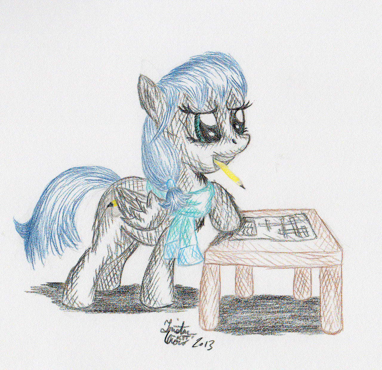 This is my submission for the NATG2013 day 8 theme: draw a pony playing a game or winning. Dusky’s a really careful thinker, so strategy and puzzle games would appeal to her. Given Equestria’s seeming lack of complex video games, I decided to run with a crossword puzzle.