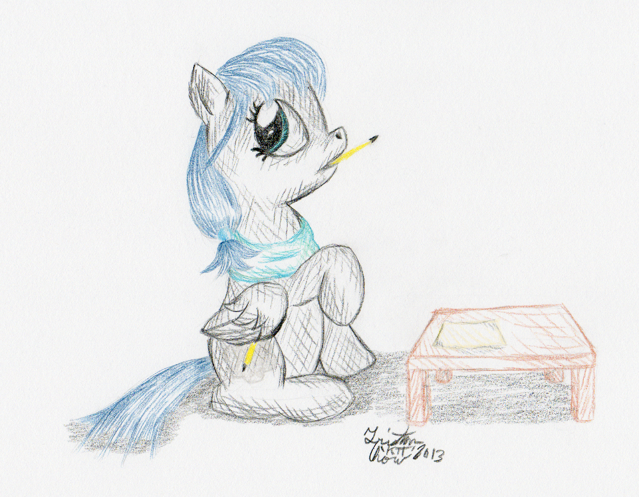 This is my submission for the NATG2013 day 27 theme: draw a pony ruling or plotting. No complicated scheme going on here, just Dusky pondering some design ideas.