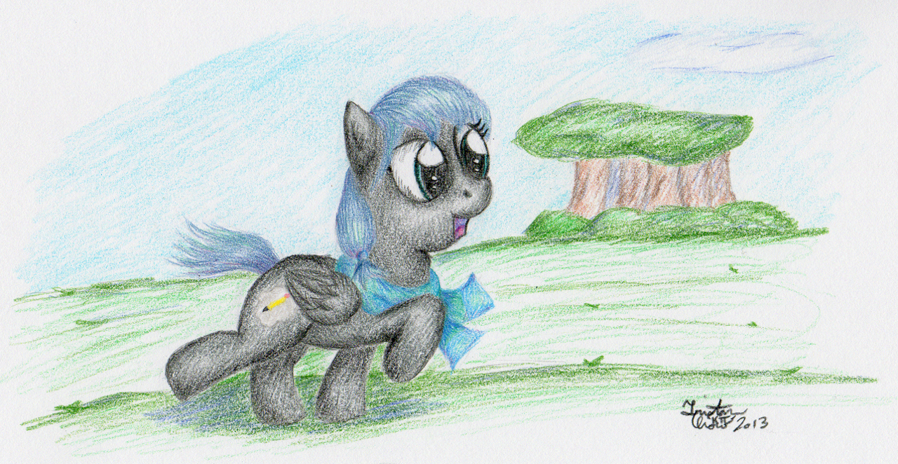 This is my submission for the NATG2013 day 30 theme: draw any previous theme or all themes, emphasis mine. Having done the “all themes” choice the last couple times, I decided to change things up a bit. So I went back and grabbed the NATG2011 day 6 theme: draw a pony as a filly or colt. Even as a filly, Dusky had a strong sense of curiosity and adventure.