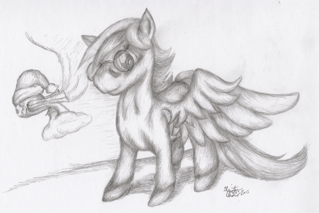 So apparently trying to combine my usual style with Chicken’s more detailed, muscular and even a bit grotesque style results in a cute, muscly mare. Who’dathunkit? Random Christmas hat steampunk thinger because why not?