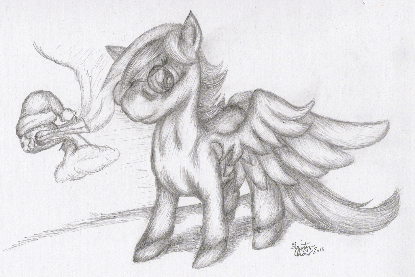 So apparently trying to combine my usual style with Chicken’s more detailed, muscular and even a bit grotesque style results in a cute, muscly mare. Who’dathunkit? Random Christmas hat steampunk thinger because why not?