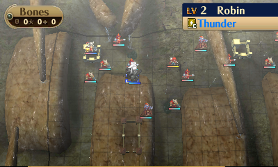 -With only the ground melee left, this is a good opportunity to get Lance WEXP. Pick each enemy off one-by-one during EP by luring them in, even if they have Counter. Robin should be in no danger of dying from a single Counter. Use the Bones Forts to heal any lost HP.