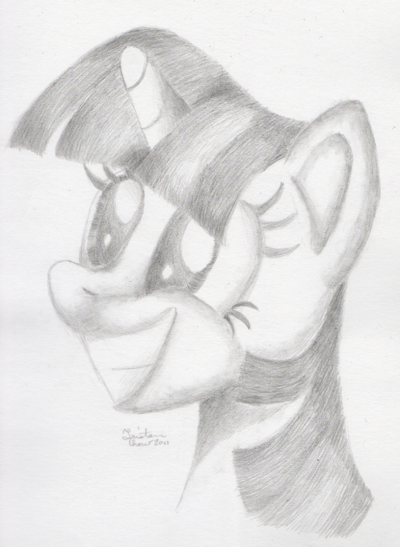 Well, this is more shading practice that I spent a bit too long on. My own fault, though, since I arbitrarily chose a random placement for the light source and in conjunction with the pose, the drawing became quite difficult. I almost left the tears out when doing the initial sketch because Twilight looked pretty happy and adorable without them. However, I decided to stick with the original plan. The tears didn’t turn out great, but I guess at least i got to practice attempting them. The pose itself is from episode 2 where Twilight has discovered the wonders of friendship (yay!).